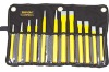 12pc punch and chisel set 1.Chrome vanadium steel,sand blasted. 2.Hardened and tempered. 3.Soft rubber grib,mutinational color avaiable. 4.Blister card packing. 5.Set including:6pcs Chisels 1/2"*6-3/4",5/8"*7" ,3/4"*8" ,13/16"*8" ,7/8"*10" ,1"*10" 4pcs Pin punches 3/16"*6" ,1/4"*9-3/4" ,5/16"*8" ,3/8"*9-1/2" 2pcs Center punches 5-3/4" ,7-7/8" 5.Set include:0.8,1.6,2.5,3.0mm.
